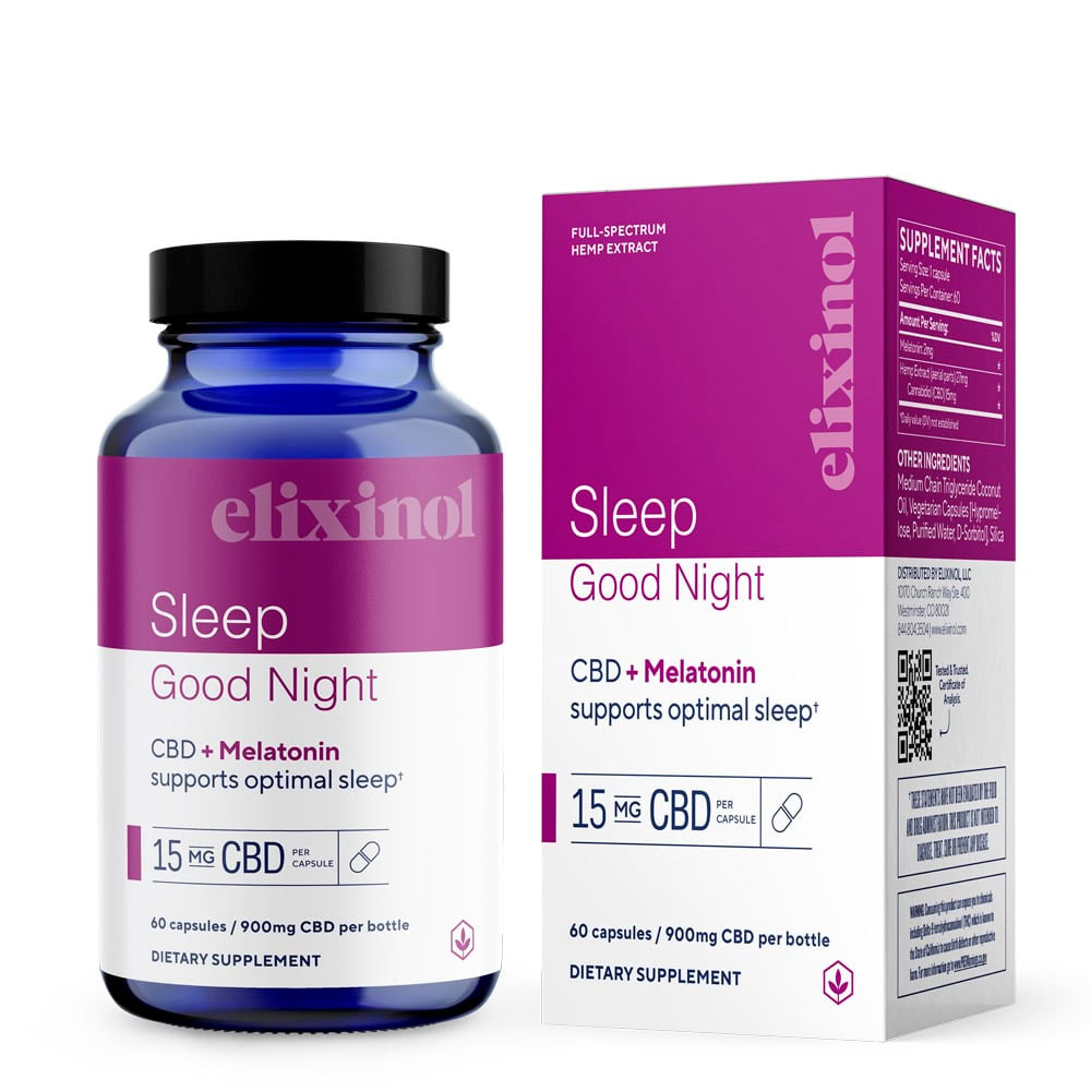 Elixinol, Sleep Good Night CBD Capsules, Full Spectrum, Melatonin, 60ct, 900mg CBD