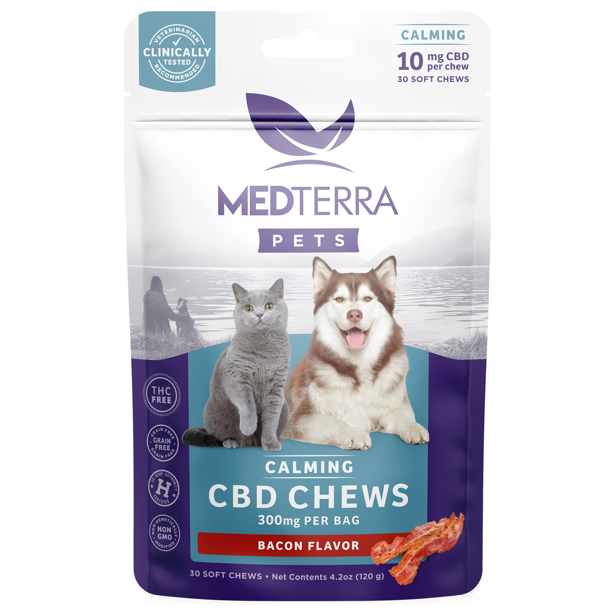 Medterra, Calming CBD Chews for Dogs + Cats, Isolate THC-Free, Bacon, 30ct, 300mg CBD